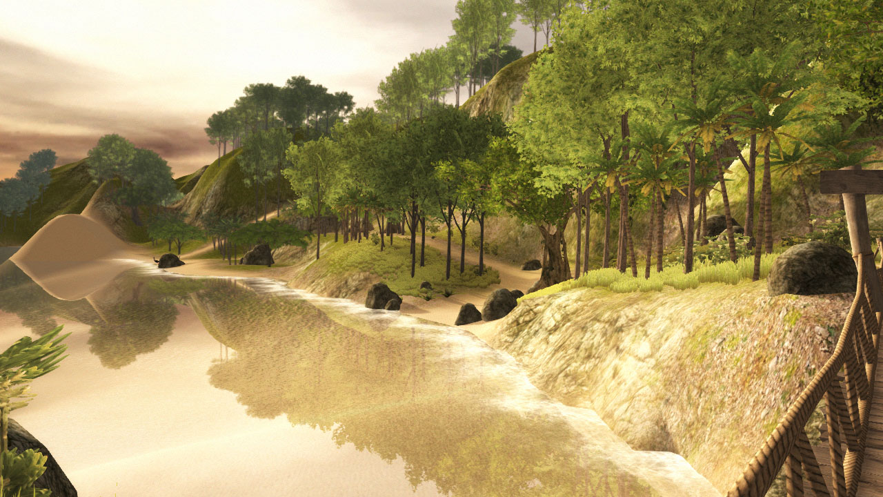 A game-like tour of an outdoor scene with different visual effects (rain, lightning, water). The goal is to collect the 10 gems scattered throughout the scene.