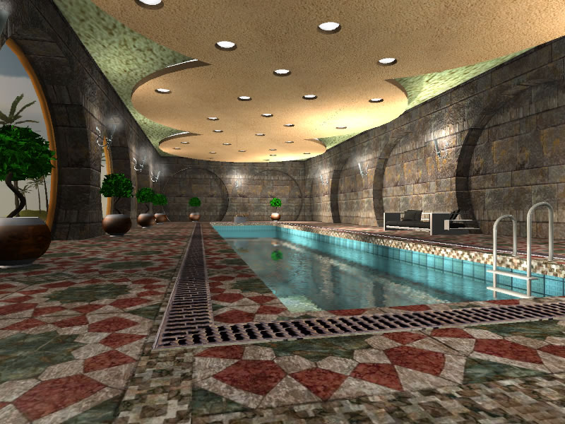 A scene containing a lit room with a swimming pool. You can jump into the pool and dive!